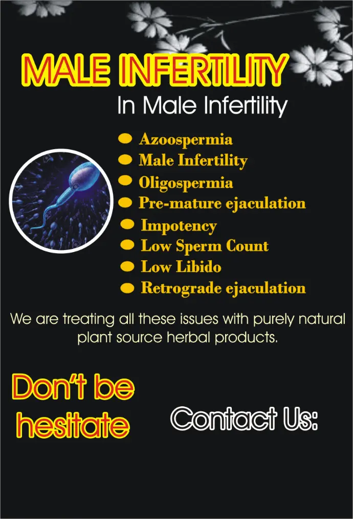A very powerful Sexual tonic for male infertility. it is pure natural and very effective in (Azoospermia, Oligiospermia, Infertility, Erectile dysfunction, low libido, low sperm count, pre-mature ejaculation, Retrograde ejaculation, pus cells in sperm count) and all that reasons underlying in infertility issue.